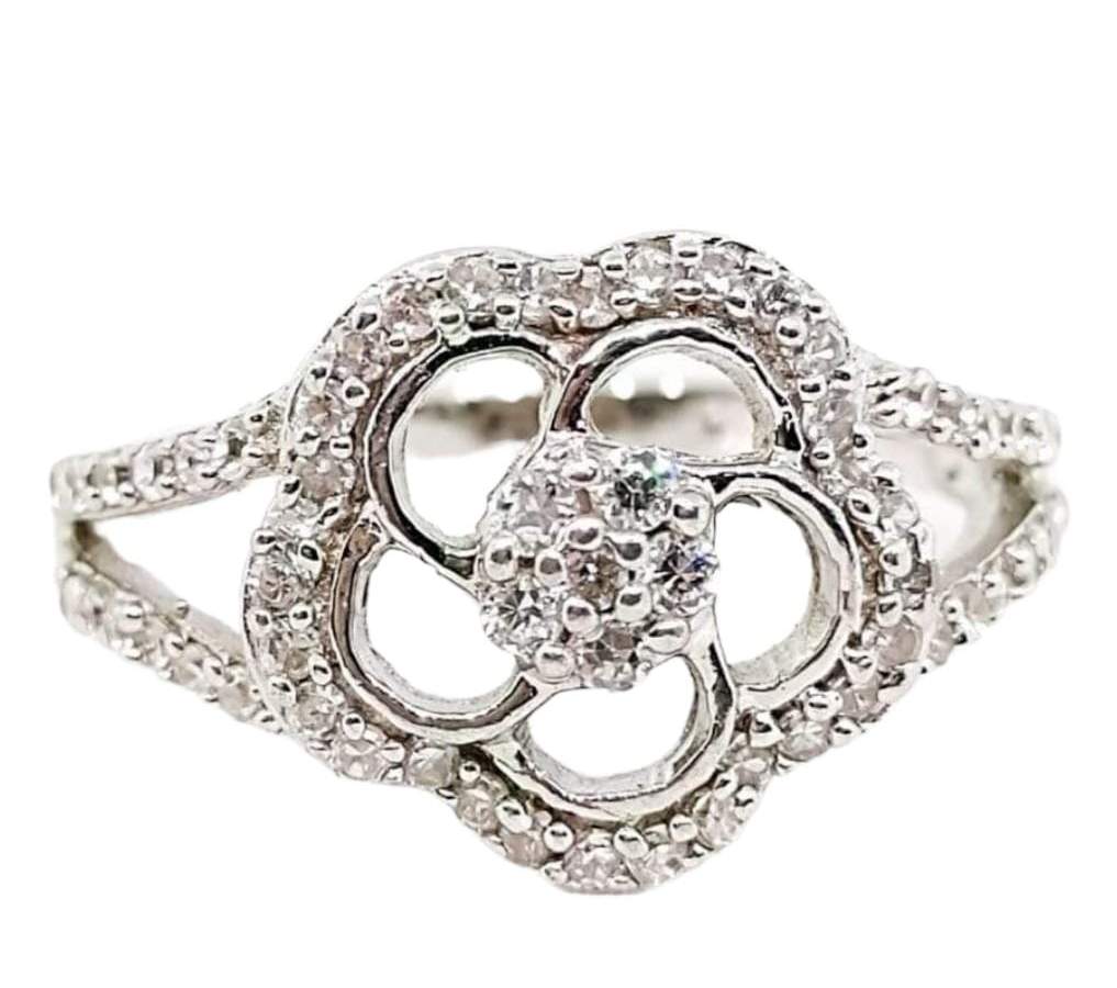 ANILLO DE PLATA CON UNA FLOR EN EL CENTRO CON CIRCONIAS QUE SE SONTIENE DE DOS FILAS CON CIRCONIAS A LOS LADOS DEL ANILLO