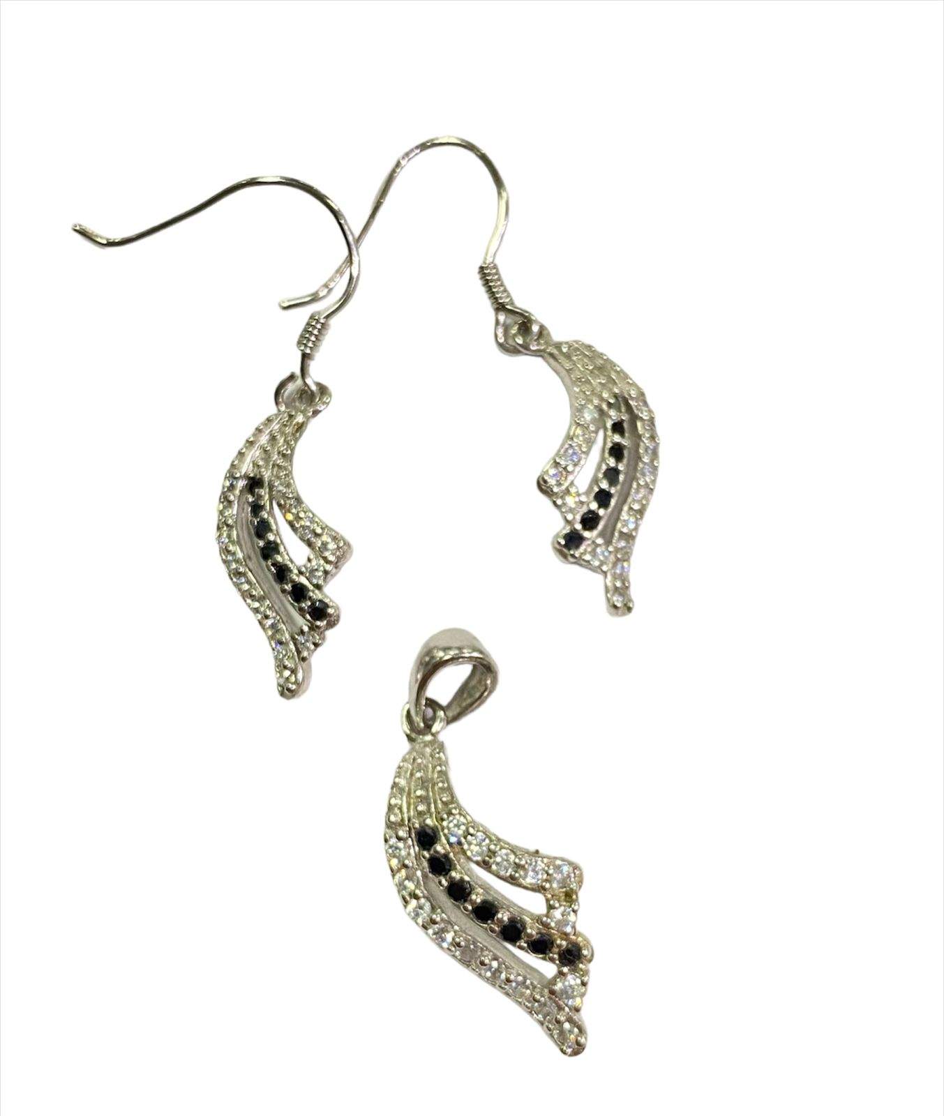 JUEGO DE DIJE Y ARETES DE GANCHO CON TRES FILAS CAIDAS DE CIRCONIAS DOS DE CIRCONIAS BLANCAS Y UNA DE CIRCONIAS NEGRAS