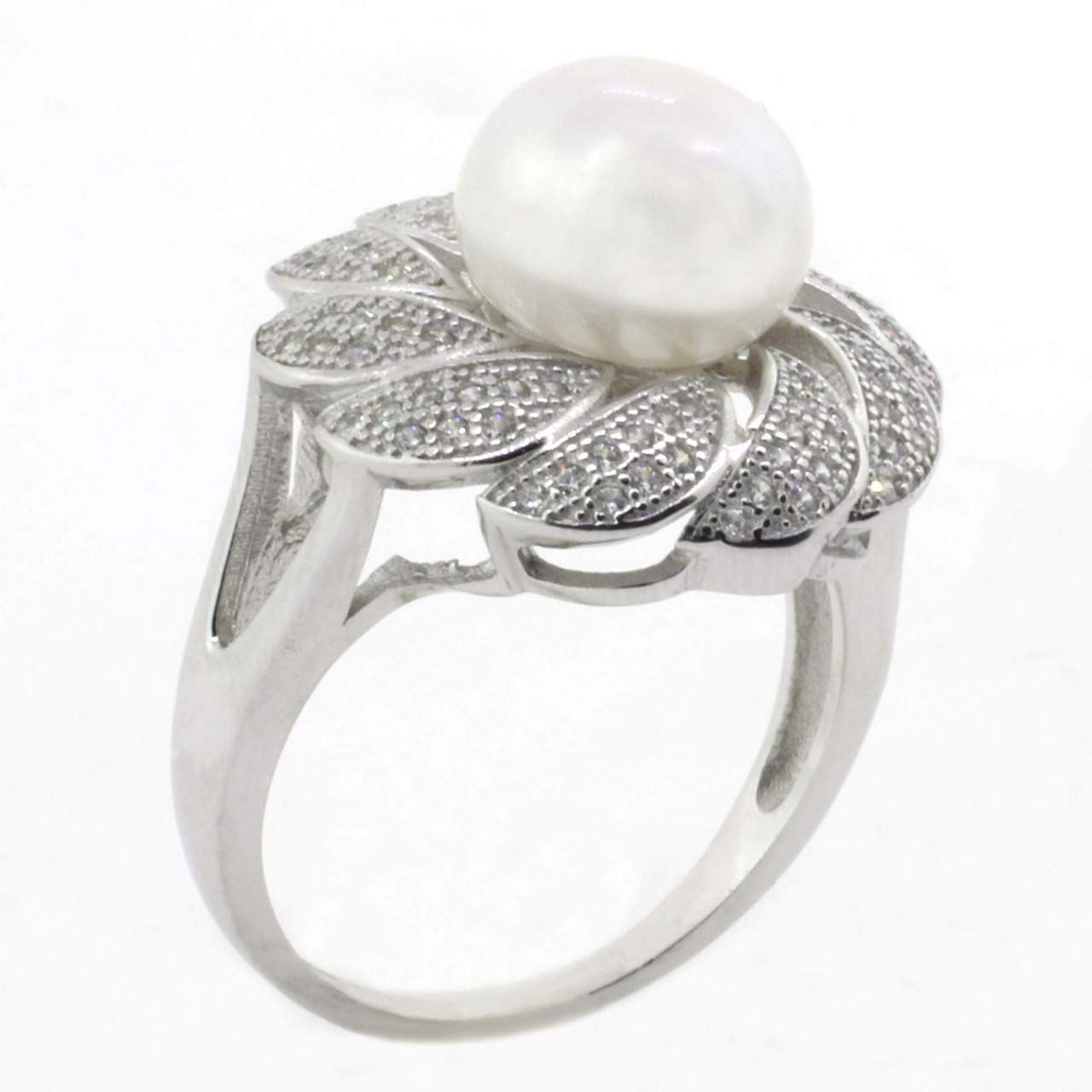ANILLO CON PERLA DE RIO NATURAL RODEADO DE CIRCONIAS EN FORMA DE FLOR