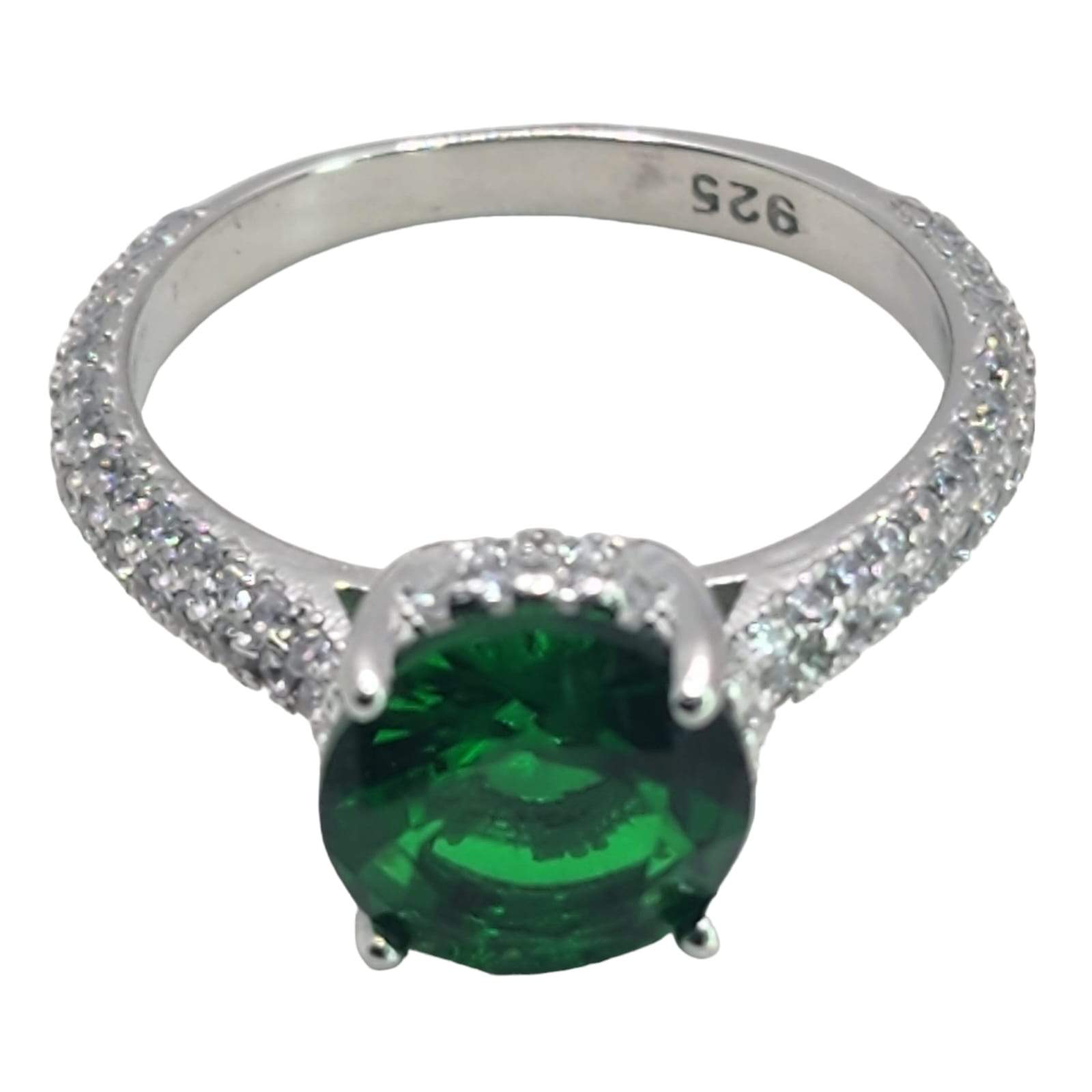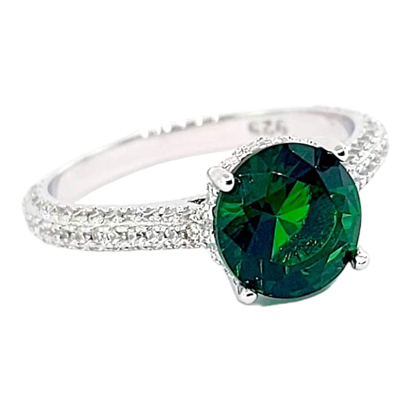 ANILLO CIRCONIA VERDE REDONDA CON CIRCONIAS A LOS LADOS Y ALREDEDOR DE LA MONTURA