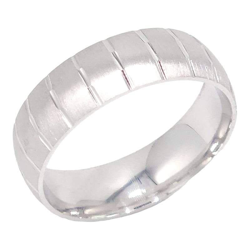 ARGOLLA DE PLATA MATIZADA DE CABALLERO DE GROSOR DE 6 MM DISEÑO REDONDEADO CON LINEAS VERTICALES LISAS BRILLANTES ALREDEDOR