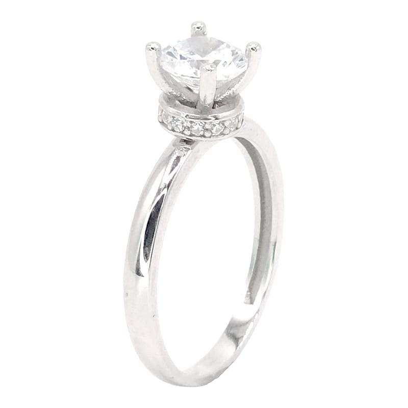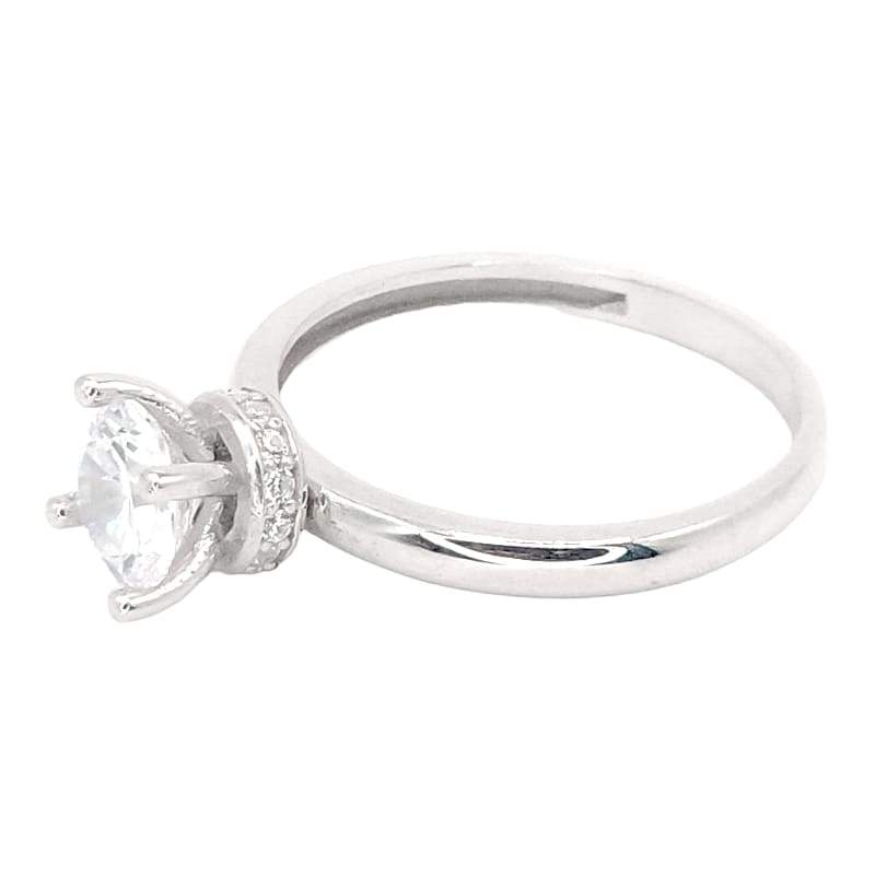 ANILLO LISO MONTURA ALTA CIRCONIA REDONDA BLANCA CON 4 PINES CON CIRCONIAS ALREDEDOR DE LA MONTURA