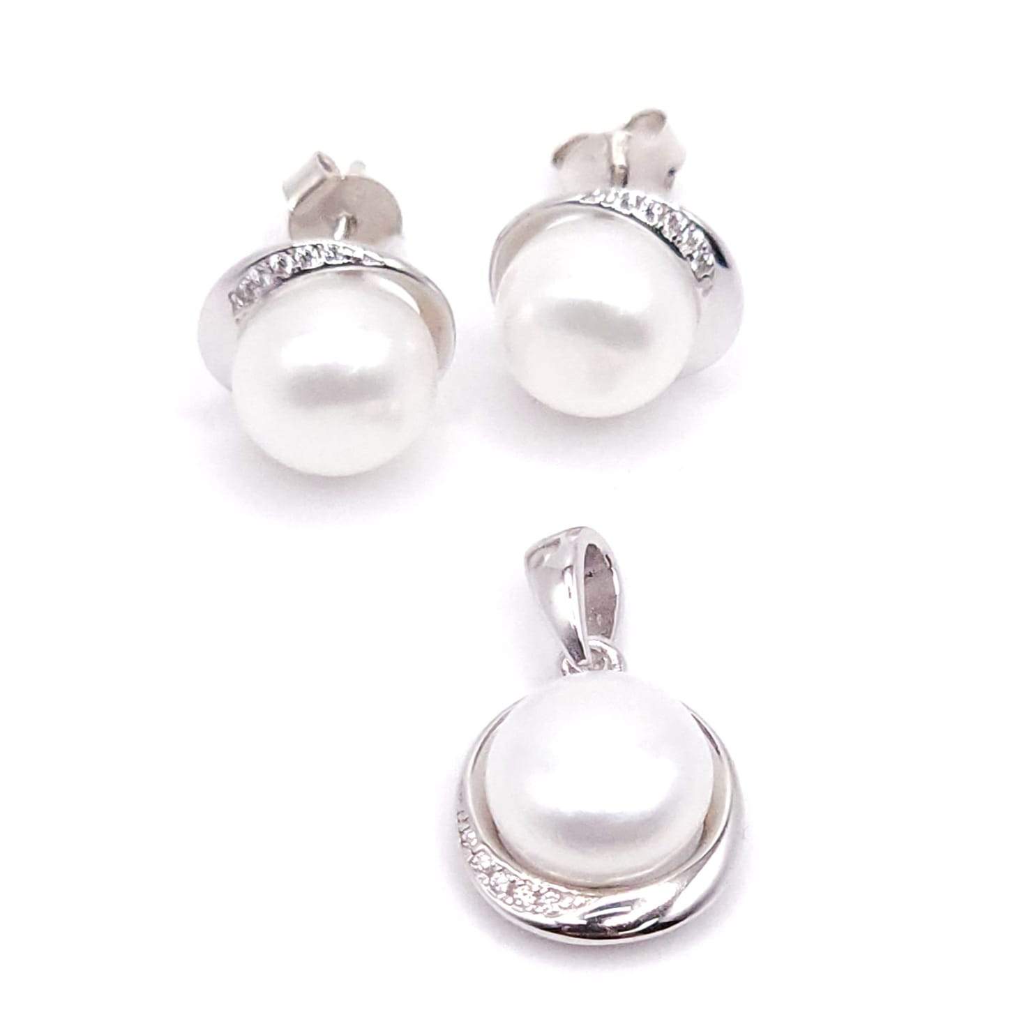 JUEGO DIJE Y ARETES PERLA DE RIO SOBRE CIRCULO DE PLATA CON CIRCONIAS