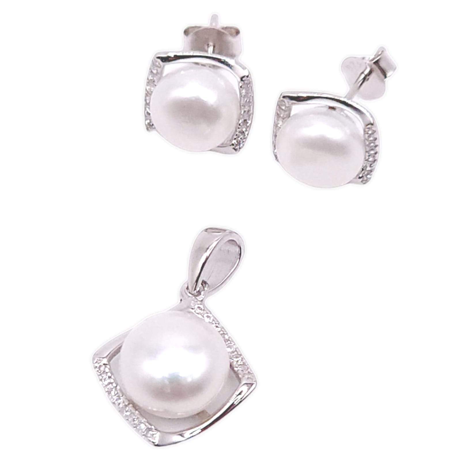 JUEGO DIJE Y ARETES PERLA DE RIO CON BASE CUADRADA DE PLATA CON CIRCONIAS
