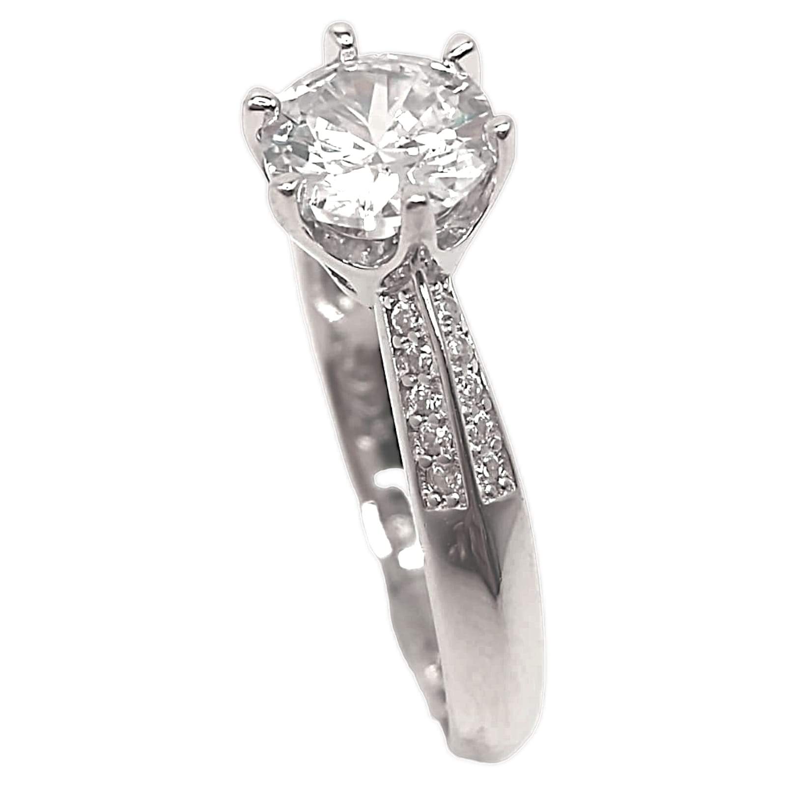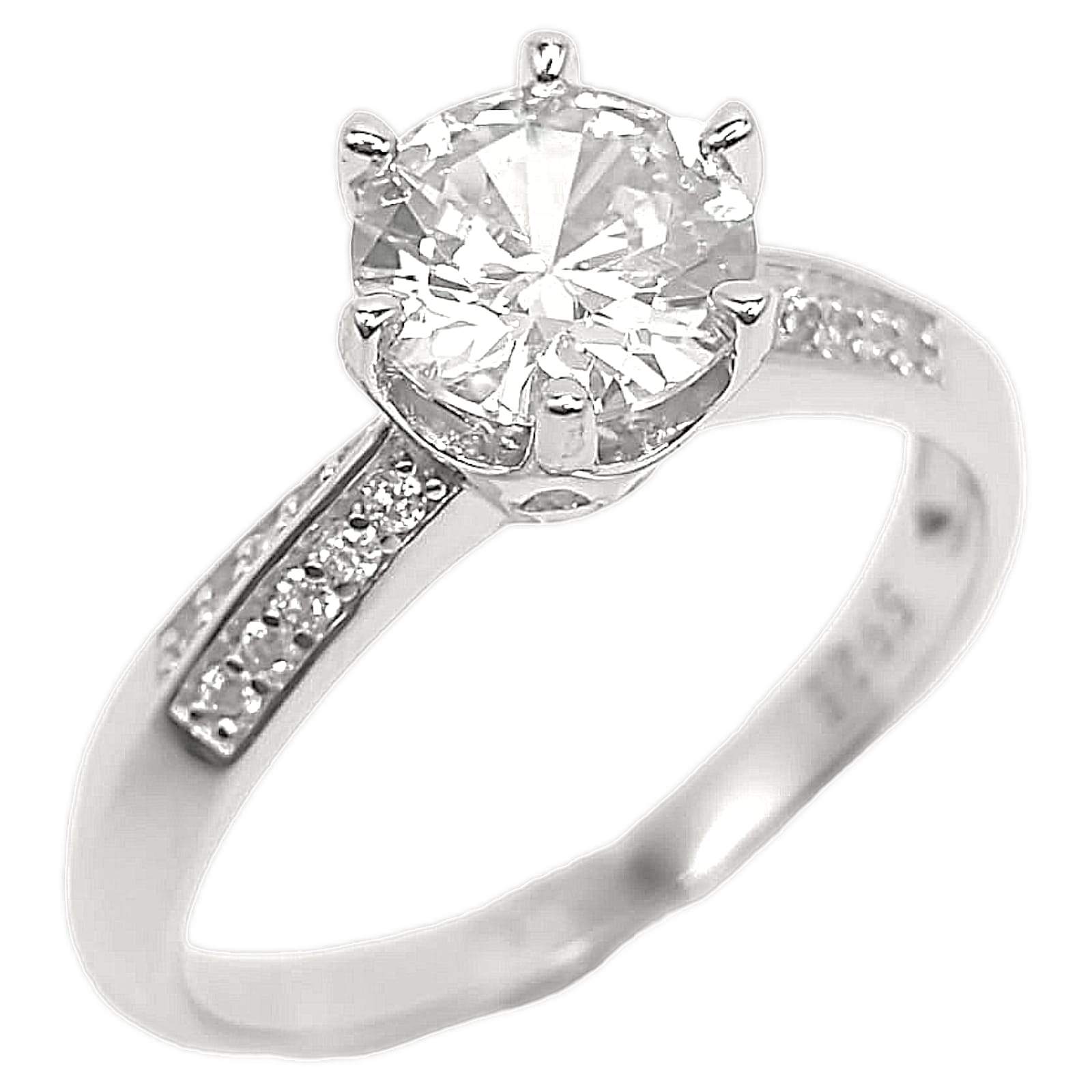 ANILLO DE 6 PINES CIRCONIA REDONDA MONTURA LISA Y 2 FILAS DE 5 CIRCONIAS DE CADA LADO.