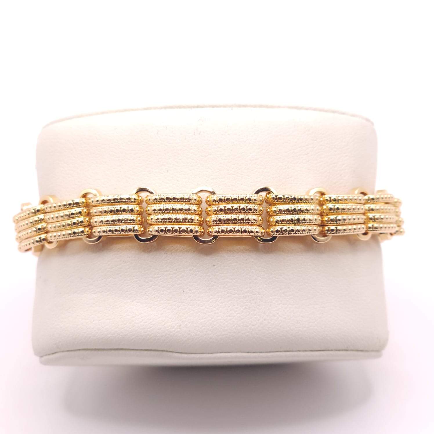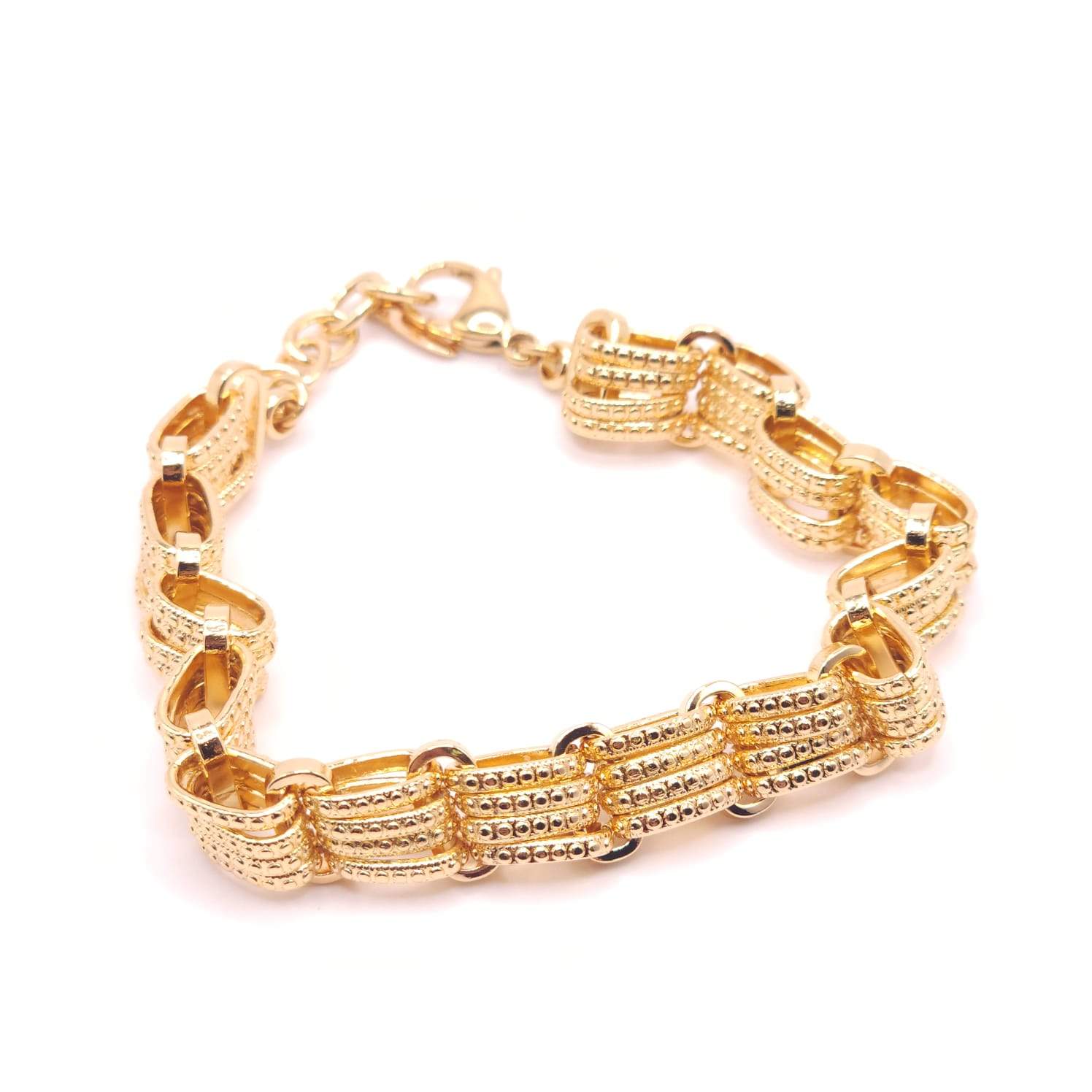 PULSERA CON 4 ESLABONES OVALODOS CON TEXTURA Y UN ESLABON DE SEPARACION LISO.