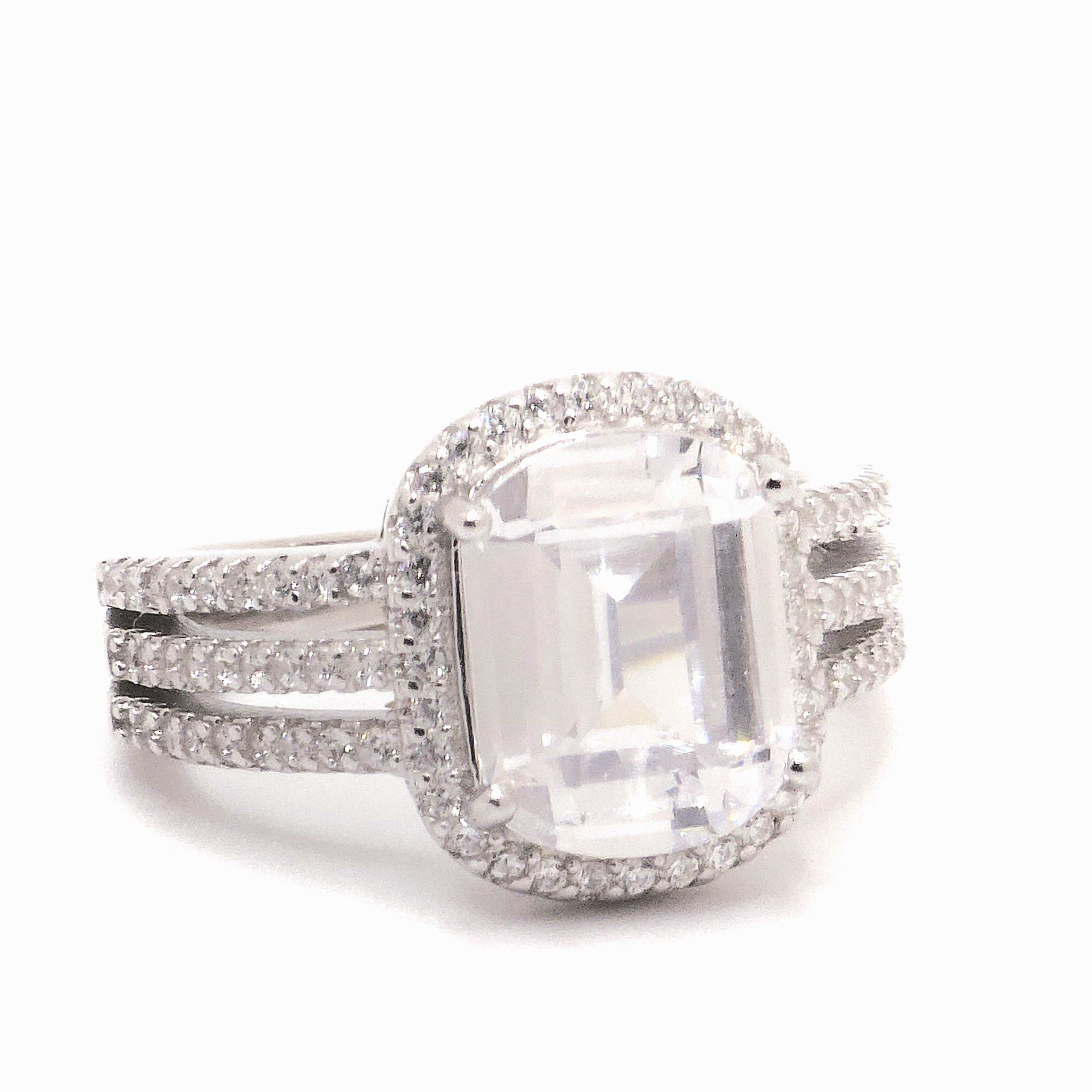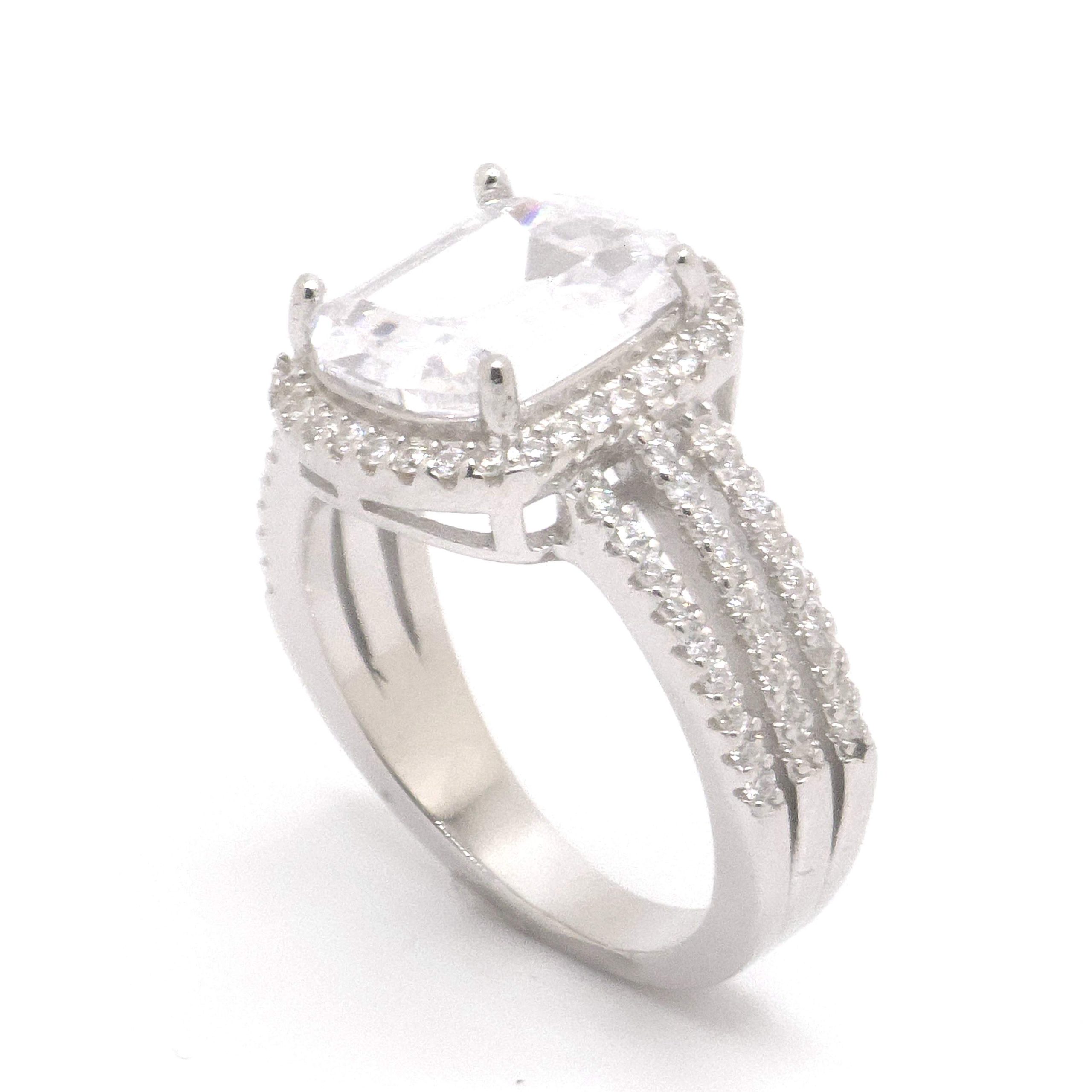 ANILLO CON 3 FILAS DE CIRCONIAS EN CADA LADO Y CIRCONIA CENTRAL RECTANGULAR DE CORTE ESMERALDA DE BORDES OVALADO CON MICRO CIRCONIAS AL REDEDOR