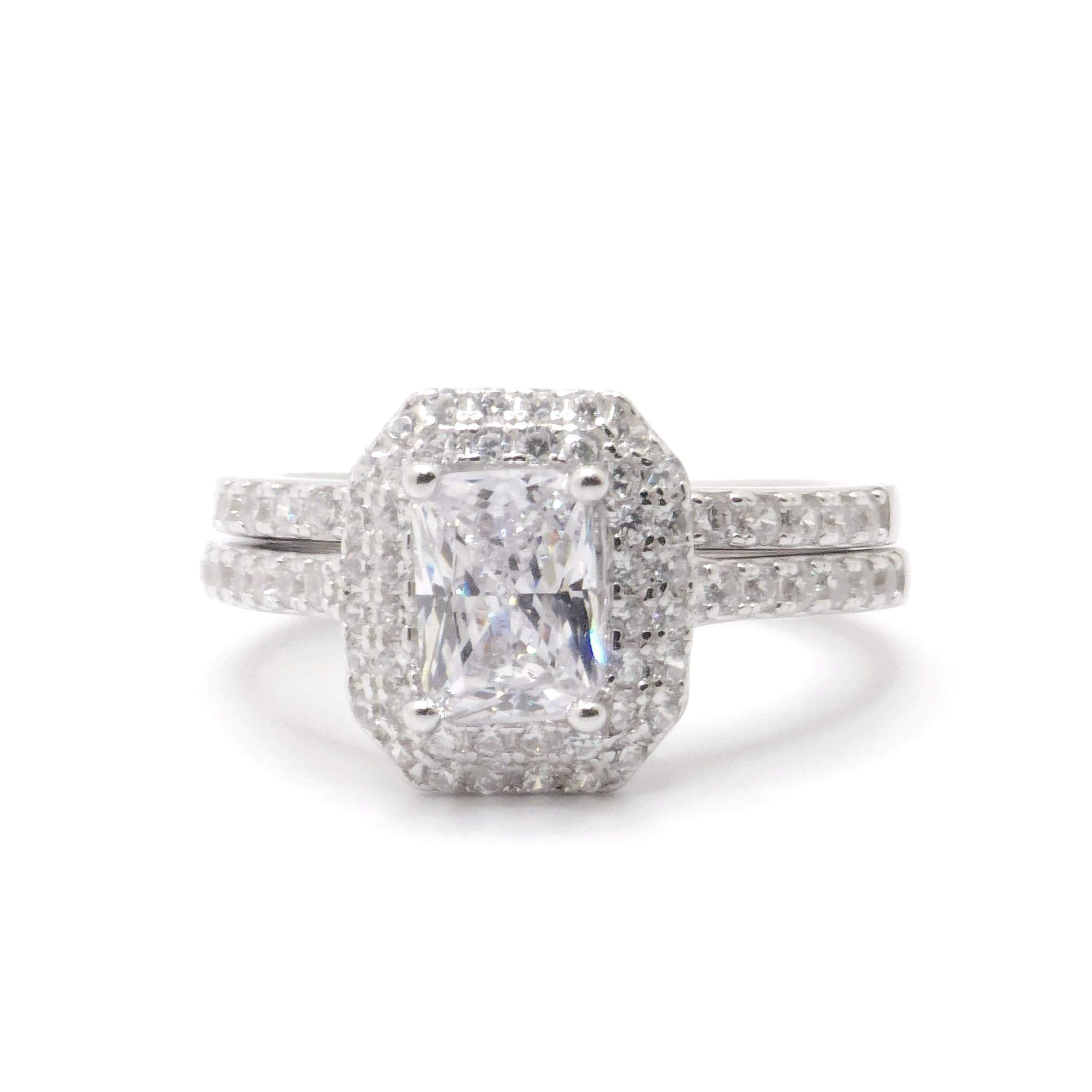 JACKET ANILLO DE CIRCONIA CENTRAL EN ESMERALDA RADIANTE CON 2 FILAS DE CIRCONIAS AL REDEDOR Y UNA FILA DE CIRCONIAS DE CADA LADO Y ARGOLLA CON CIRNCONIAS FRONTALES.