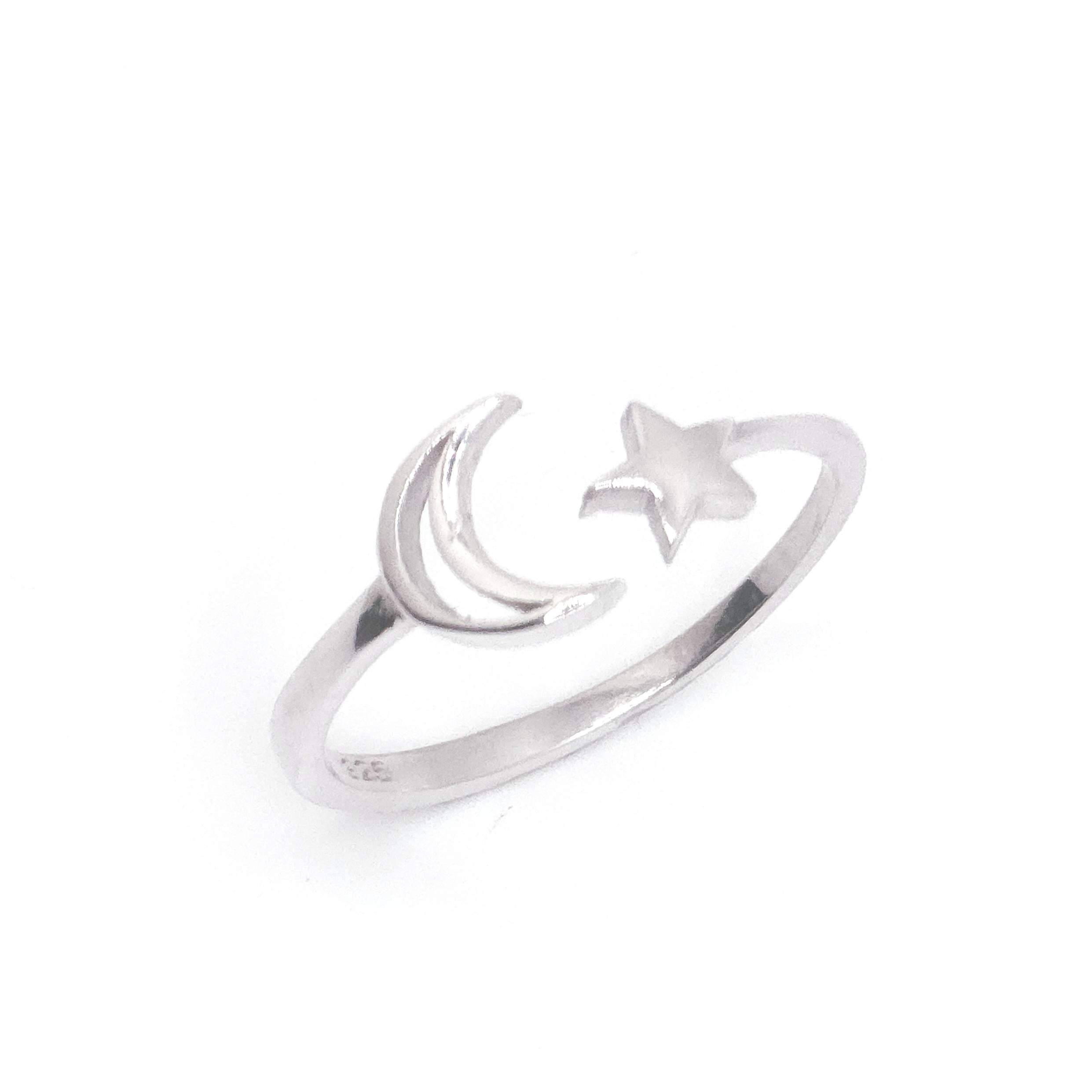 ANILLO LISO SEMIABIERTO CON UNA LUNA CALADA Y DEL OTRO EXTREMO UNA ESTRELLA LISA