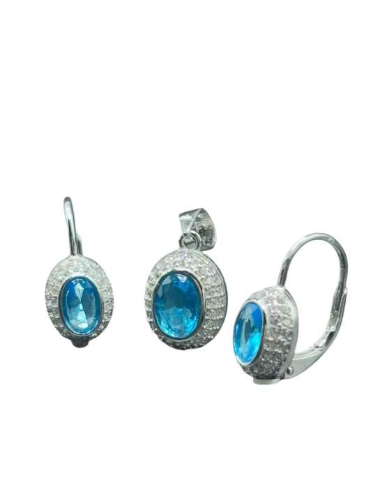 JUEGO DIJE Y ARETES OVALADO DE GANCHO CERRADO CON CIRCONIA AGUA MARINA Y 2 FILAS DE CIRCONIAS BLANCAS ALREDEDOR.