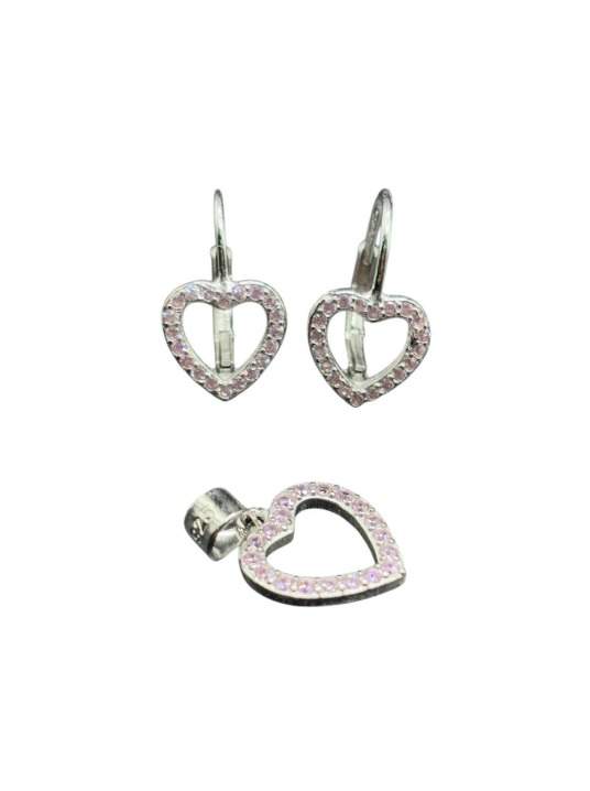JUEGO DIJE Y ARETES GANCHO CERRADO SILUETA DE CORAZON CALADO Y UNA FILAS DE CIRCONIAS ROSADAS ALREDEDOR.