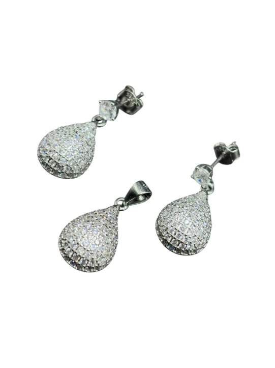 JUEGO DIJE Y ARETES DISEÑO DE GOTA DE MICROPAVE Y UNA CIRCONIA BLANCA
