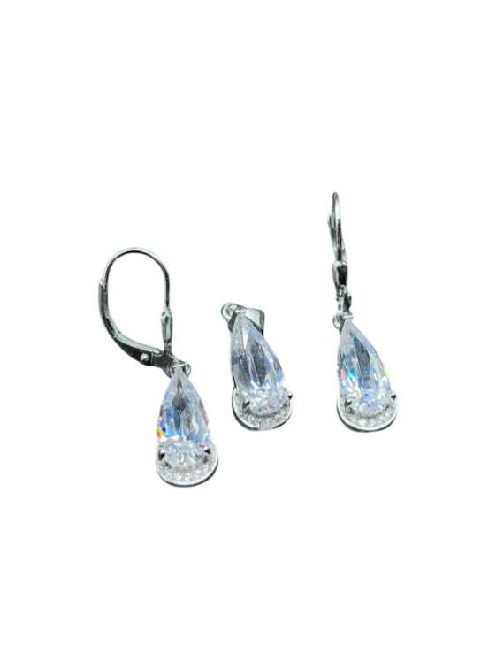 JUEGO DIJE Y ARETES DE CIRCONIA BLANCA EN FORMA DE GOTA CON 5 MICROCIRCONIAS BLANCAS.