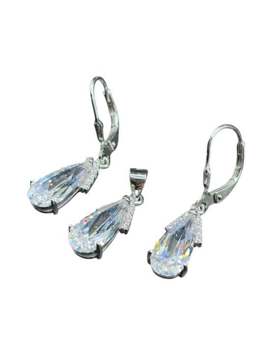 JUEGO DIJE Y ARETES DISEÑO GOTA DE CIRCONIA BLANCA CON 2 FILAS DE CIRCONIAS SUPERIOR.