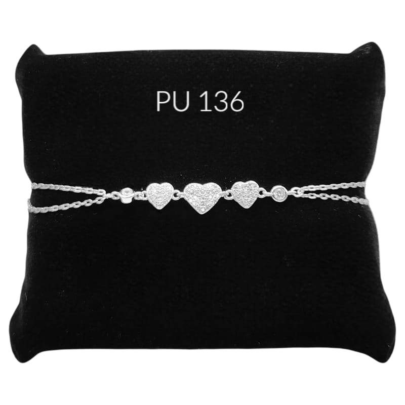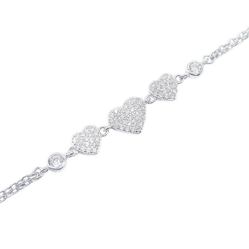 PULSERA DOBLE CADENA CON 3 CORAZONES MICRO PAVE 2 CIRCONIAS BISELADAS 16CM + 3CM DE EXTENSION