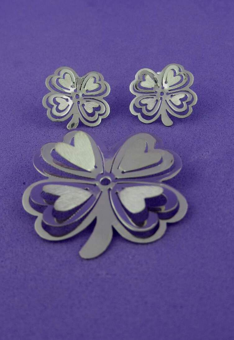 JUEGO DE DIJE Y ARETES MEDIANOS DE PLATA LISA EN FORMA DE TREBOL, MARIPOSA, LIBELULA, FLOR DOBLE