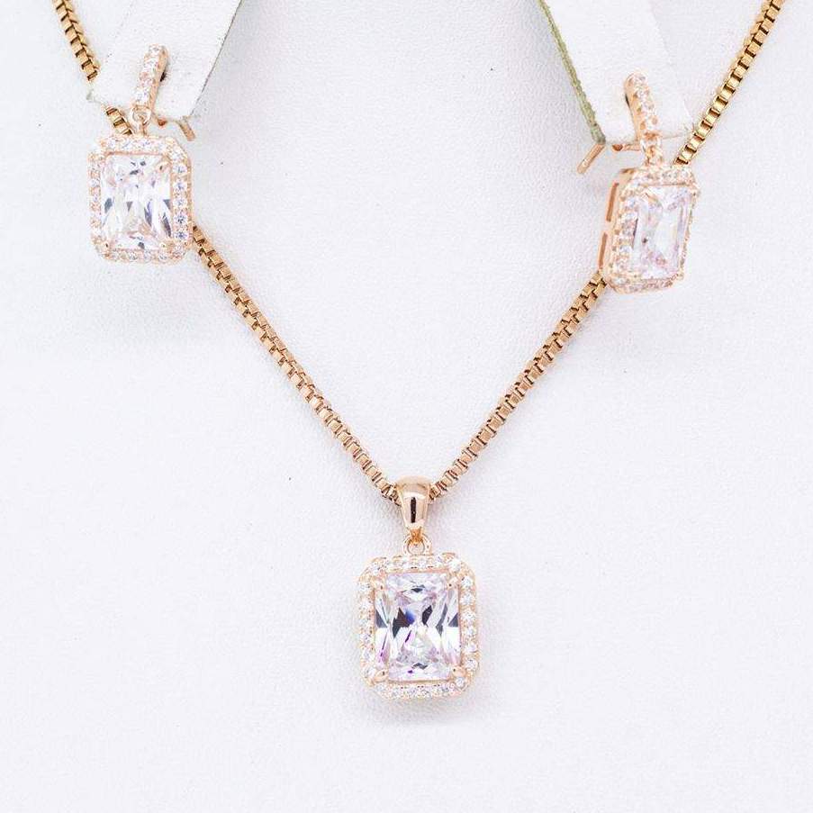 JUEGO DIJE Y ARETES RECTANGULO ORO ROSA CON CIRCONIA BLANCAS (NO INCLUYE CADENA)