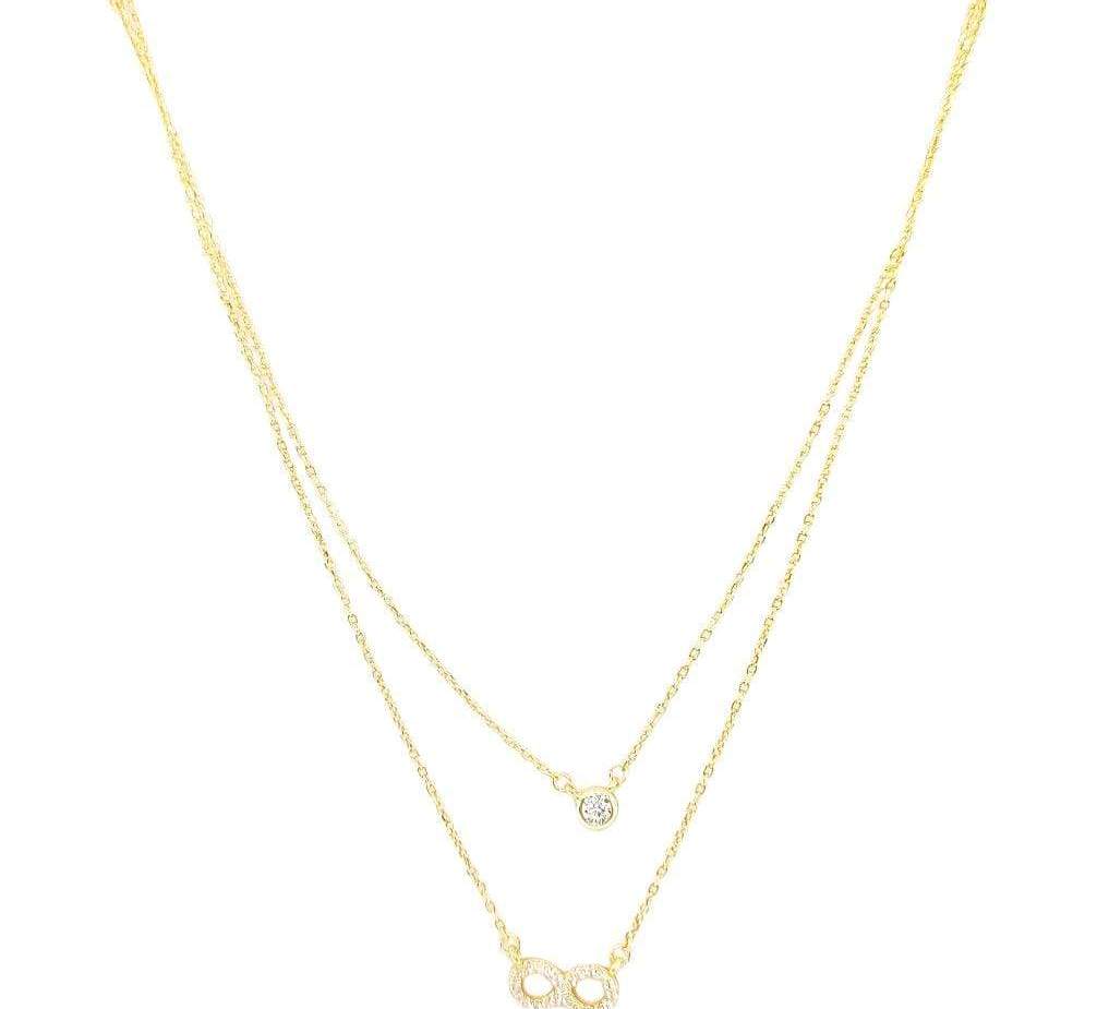 CADENA DE 2 HILOS CON UNA CIRCONIA BLANCA Y DIJE DE INFINITO CON MICROCIRCONIAS COLOR DORADO