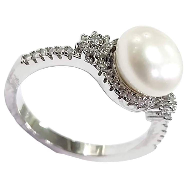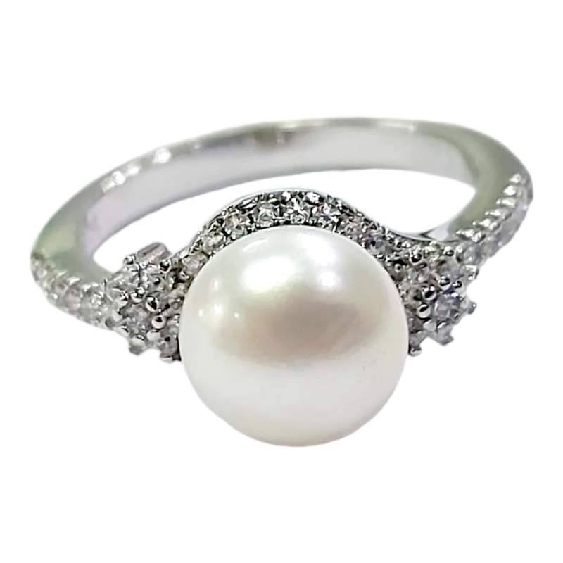 ANILLO DE PERLA DE RIO CON CIRCONIAS BLANCAS ALREDEDOR Y A LOS LADOS