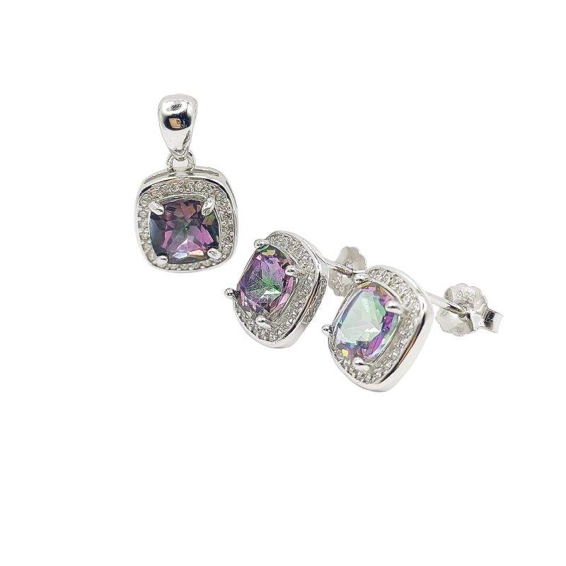 JUEGO DIJE Y ARETES COLOR PLATEADO TOPACIO MISTICO PLATA 925