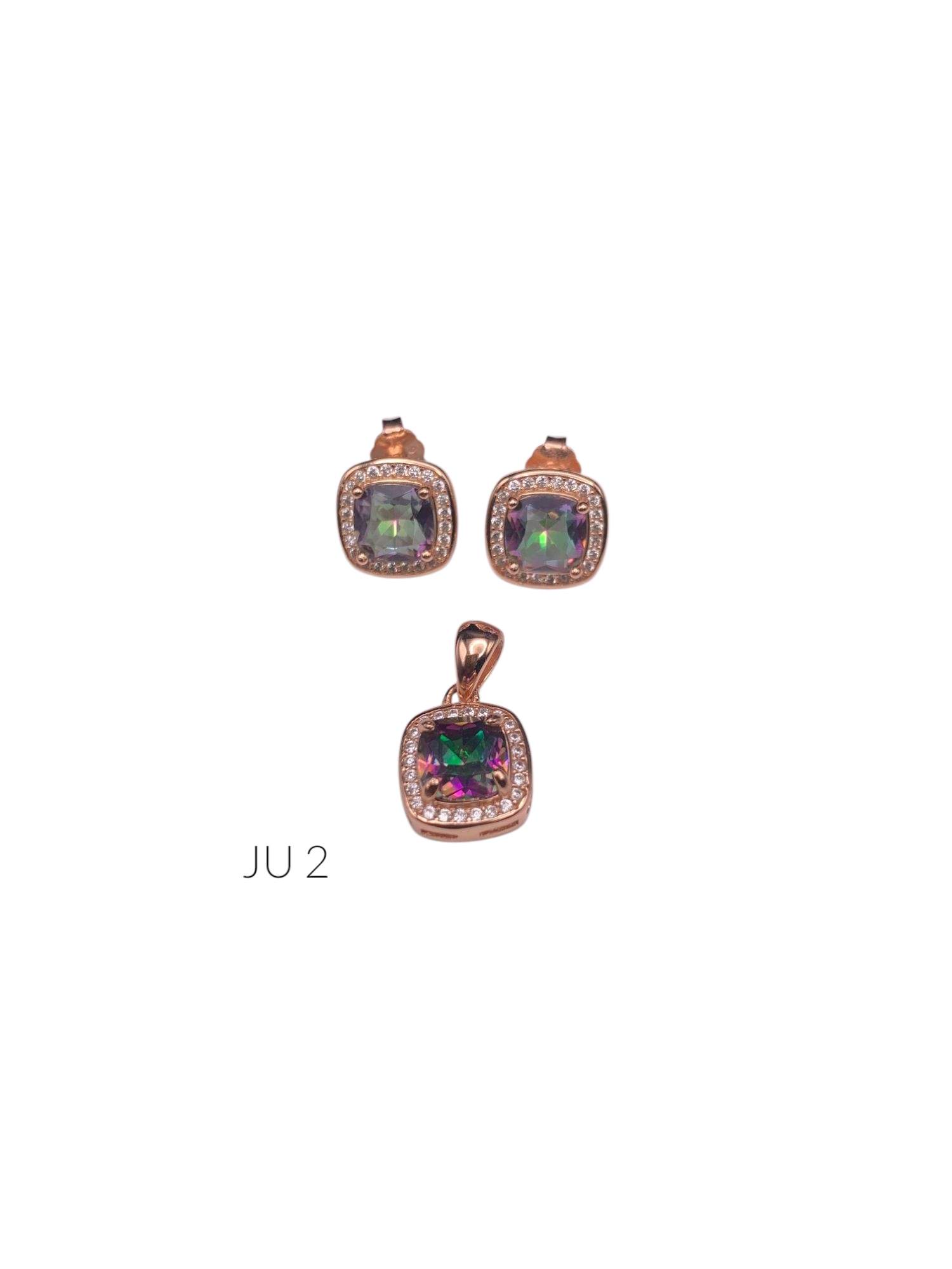 JUEGO DIJE Y ARETES ORO ROSA TOPACIO MISTICO PLATA 925
