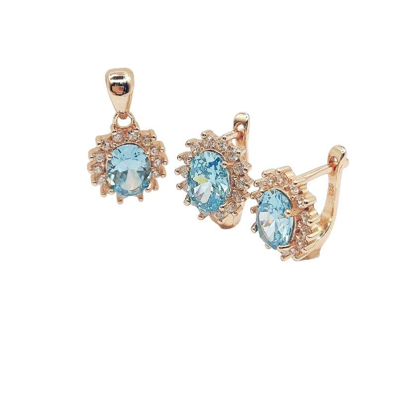 JUEGO DIJE Y ARETES ORO ROSA OVALADO CON CIRCONIA TURQUESA Y CIRCONIAS BLANCAS ALREDEDOR PLATA 9.25