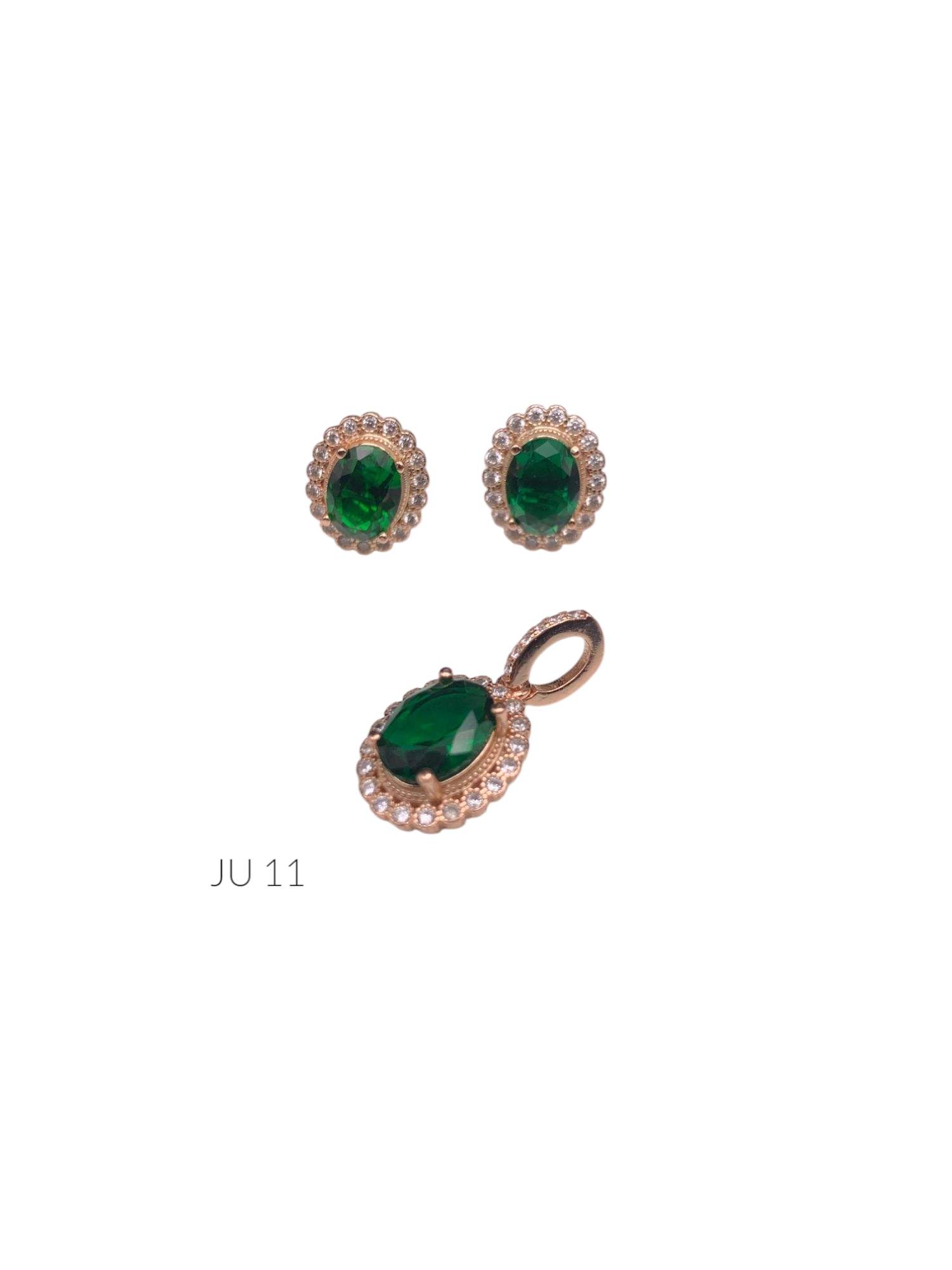 JUEGO DE DIJE Y ARETES OVALADO CON CIRCONIAS ALREDEDOR Y CIRCONIA CENTRAL VERDE CON POSTE CON BAÑO ORO ROSA