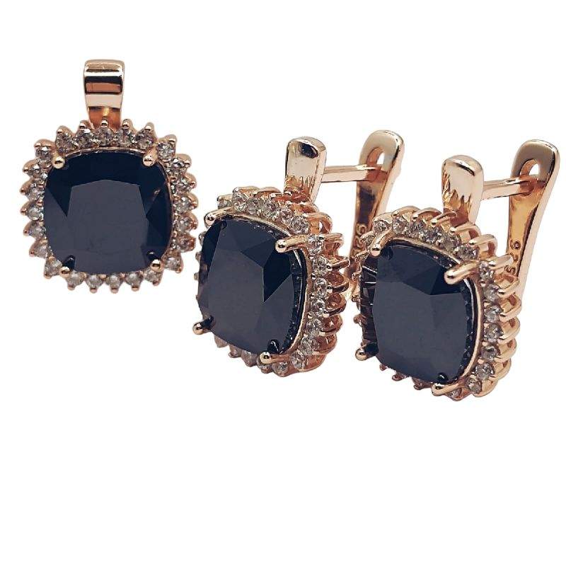 JUEGO DE DIJE Y ARETES CUADRADOS CON CIRCONIA NEGRA Y MICROCIRCONIAS BLANCAS ALREDEDOR CON BROCHE INGLES CON BAÑO ROSA