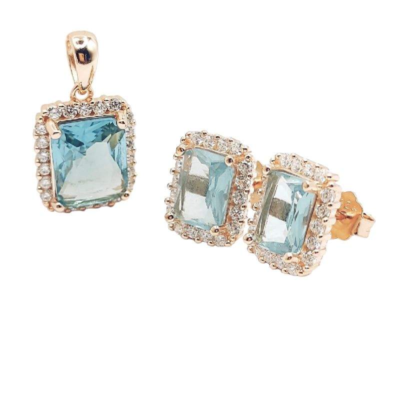 JUEGO DE DIJE Y ARETES RECTANGULAR CON CIRCONIA CENTRAL TURQUEZA Y MICROCIRCONIAS BLANCAS ALREDEDOR Y CON POSTE ORO ROSA