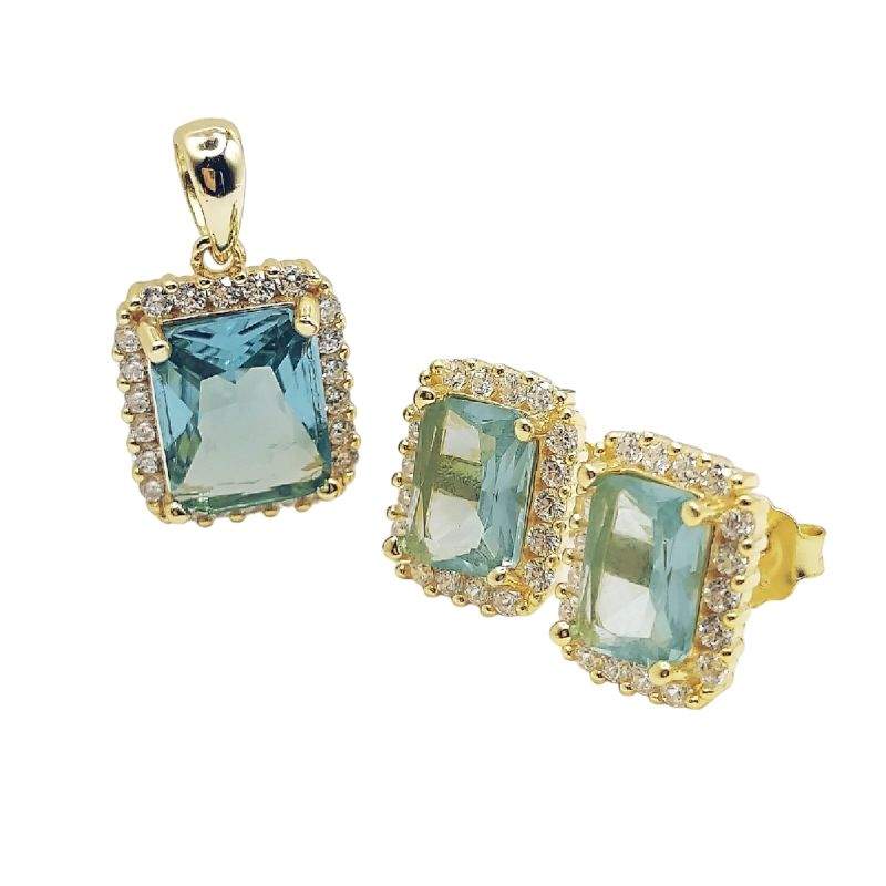 JUEGO DE DIJE Y ARETES RECTANGULAR CON CIRCONIA CENTRAL TURQUEZA Y MICROCIRCONIAS BLANCAS ALREDEDOR Y CON POSTE DORADO