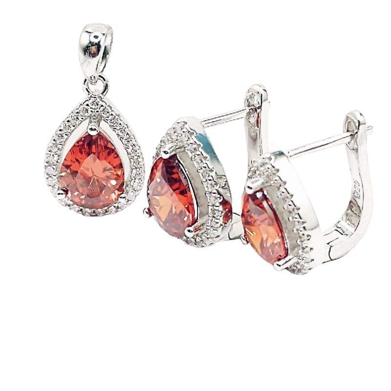 JUEGO DE DIJE Y ARETES CON BROCHE INGLES DE GOTA ROJA CON MICROCIRCONIAS BLANCAS PLATEADO