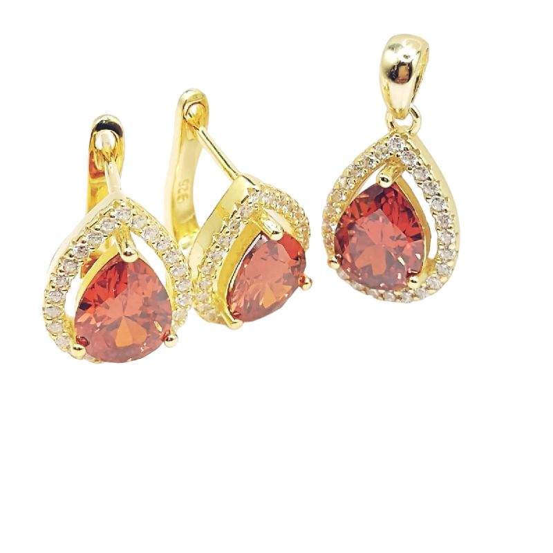 JUEGO DE DIJE Y ARETES CON BROCHE INGLES DE GOTA ROJA CON MICROCIRCONIAS BLANCAS DORADO