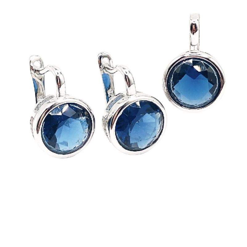 JUEGO DE DIJE Y ARETES AZUL REDONDO PLATEADO BROCHE INGLES