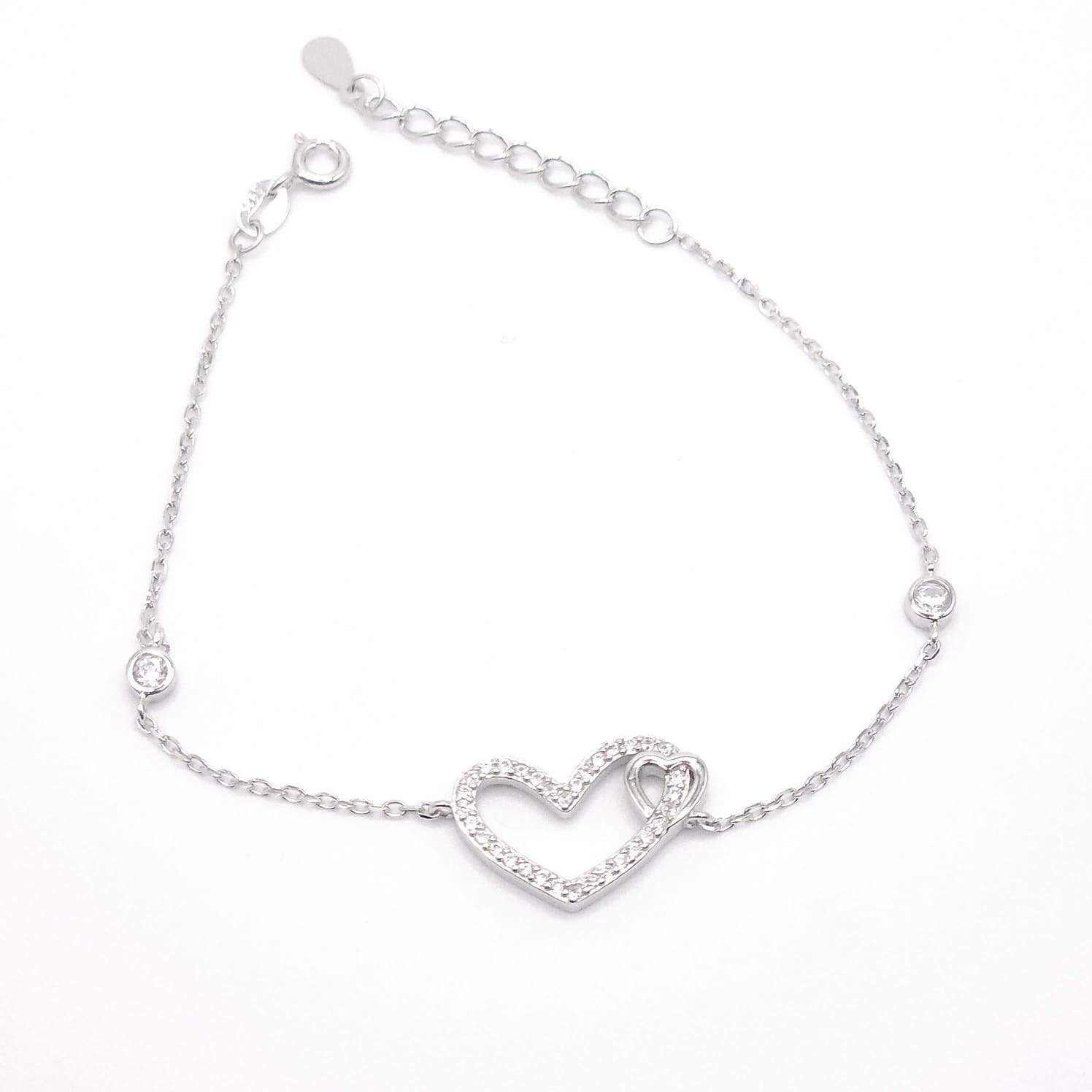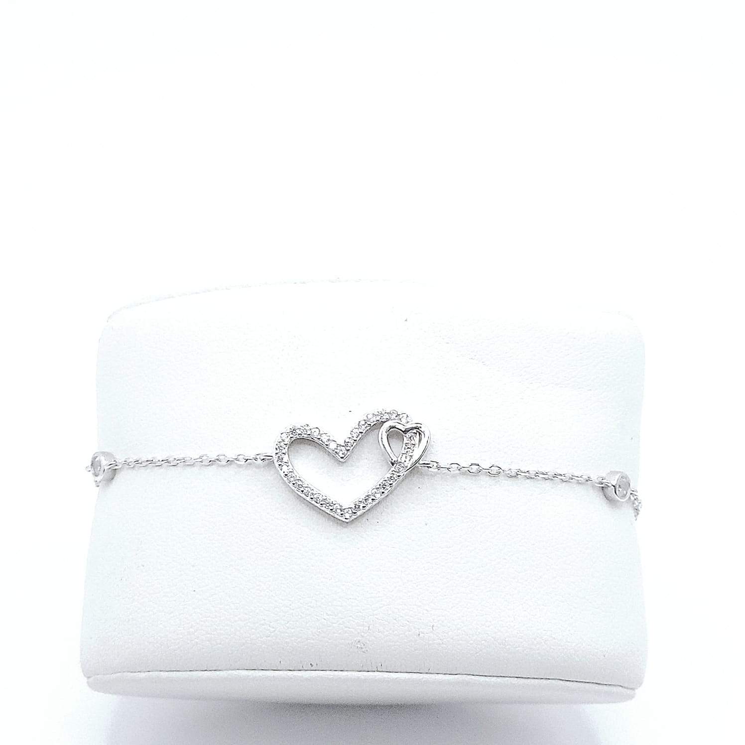 PULSERA CON DIJE DE CORAZON CALADO CON CIRCONIAS ALREDEDOR E INCRUSTADO CORAZON PEQUEÑO LISO EN CADA EXTREMO Y UNA CIRCONIA BLANCA BISELADA