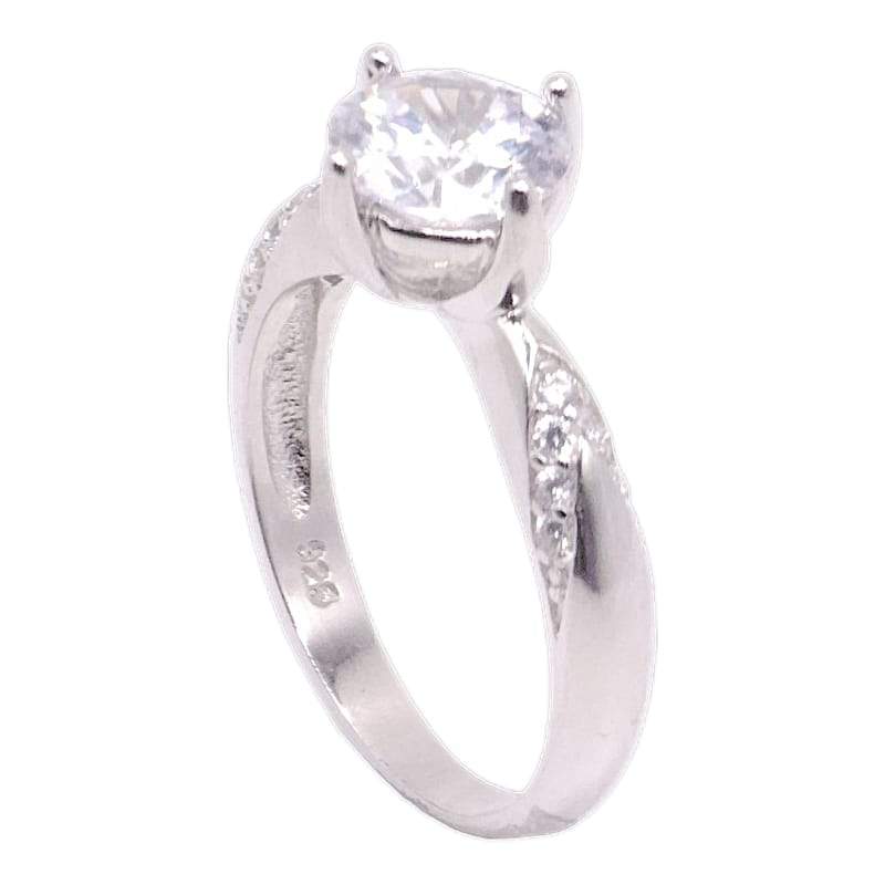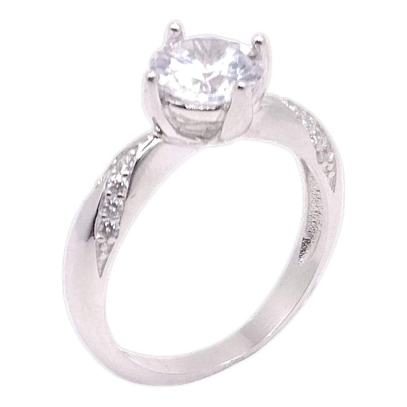 ANILLO CIRCONIA BLANCA CON 4 PINES UNA BANDA LISA ALREDEDOR DE LA CIRCONIAY CIRCONIAS A LOS LADOS FORMANDO UNA V