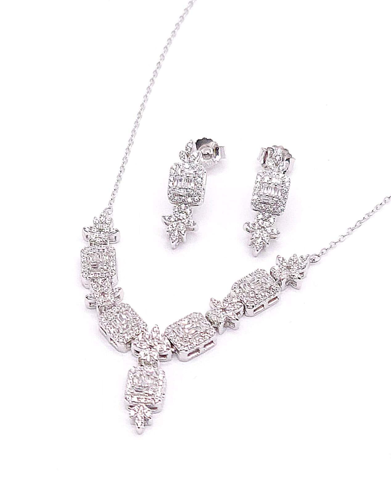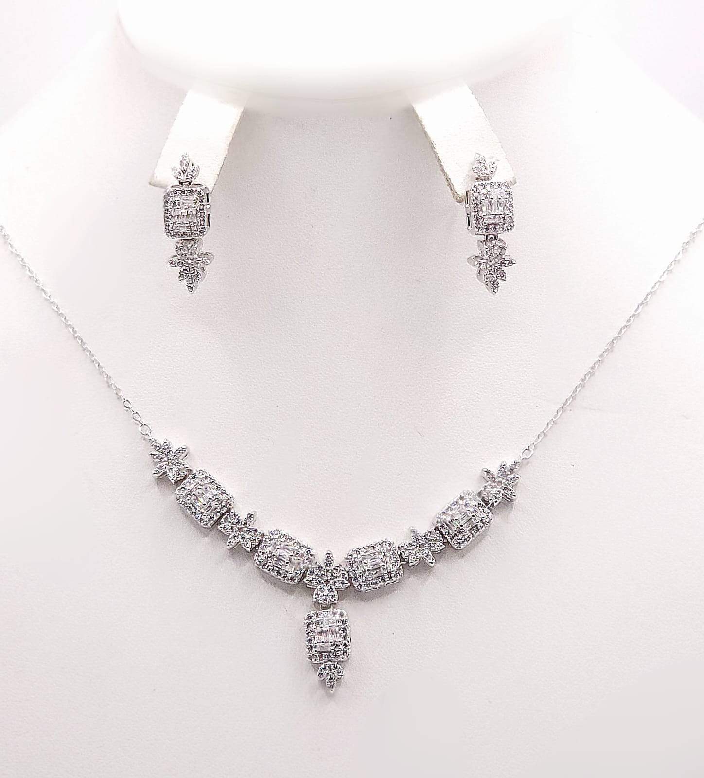 JUEGO GARGANTILLA EN FORMA DE V CON 5 RECTANGULOS DE BAGUETTE Y ORILLA DE CIRCONIAS CON 5 FLORES INTERCALADAS CON 5 PETALOS DE CIRCONIA Y ARETES DE PIN CON RECTANGULO Y FLOR.