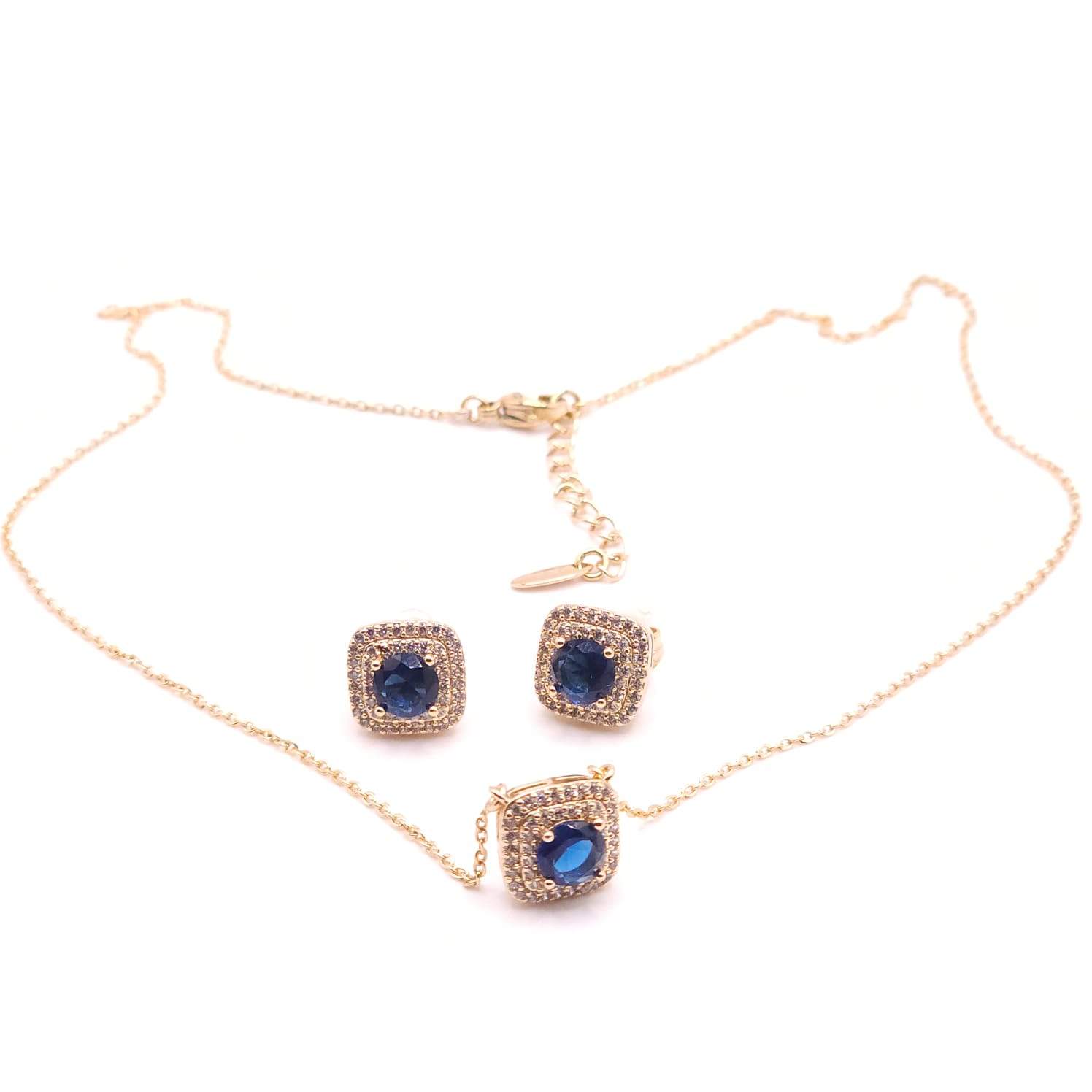 JUEGO DE ARETES Y GARGANTILLA DISEÑO CUADRADO CON CIRCONIA CENTRAL AZUL Y DOS FILAS DE CIRCONIAS BLANCAS ALREDEDOR EN ORO ROSA