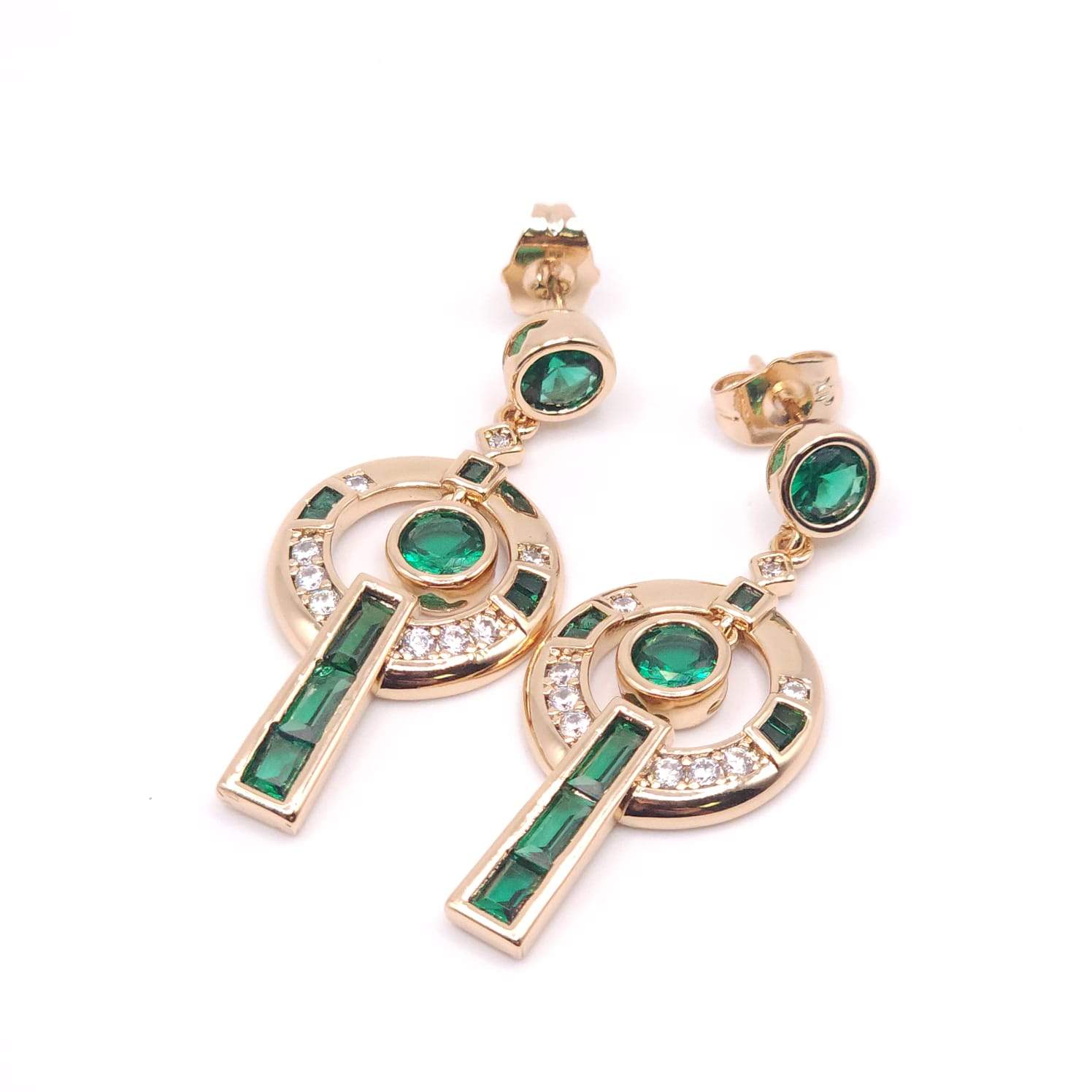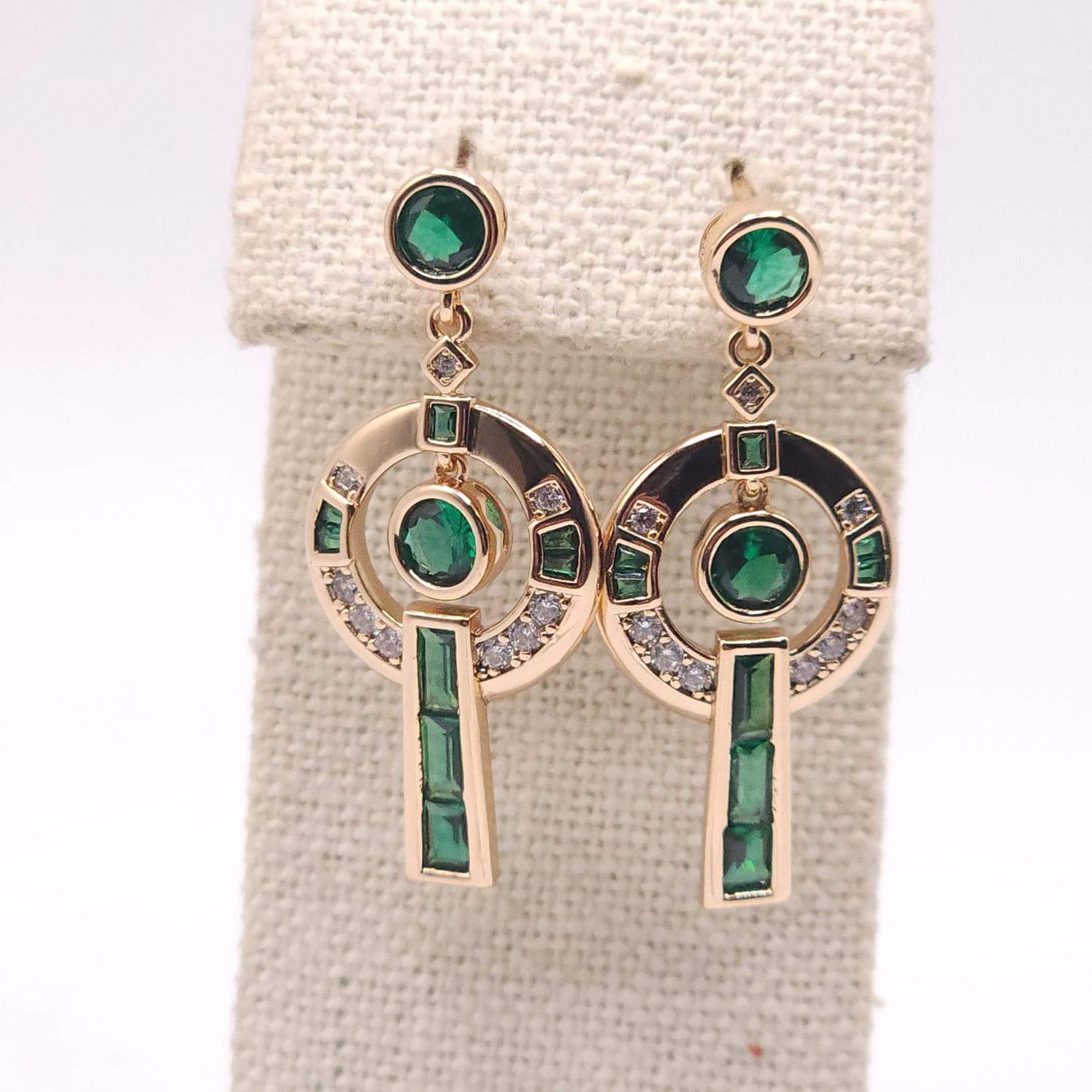 ARETES LARGOS CON UNA CIRCONIA BISELADA Y UNA FILA HORIZONTAL DE BAGUETTE EN COLOR VERDE