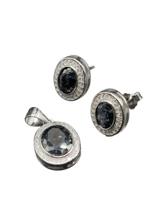 JUEGO DE DIJE Y ARETES OVALADO CON PIEDRA AVENTURINA NEGRA Y CON CIRCONIAS BLANCAS ALREDEDOR