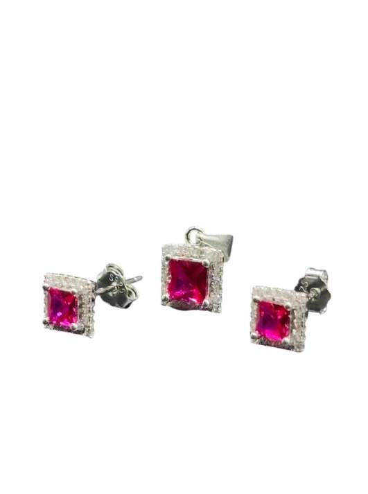 JUEGO DE DIJE Y ARETES CUADRADO PEQUEÑO CON CIRCONIA CENTRAL DE COLOR FUCSIA Y CIRCONIAS BLANCAS ALREDEDOR