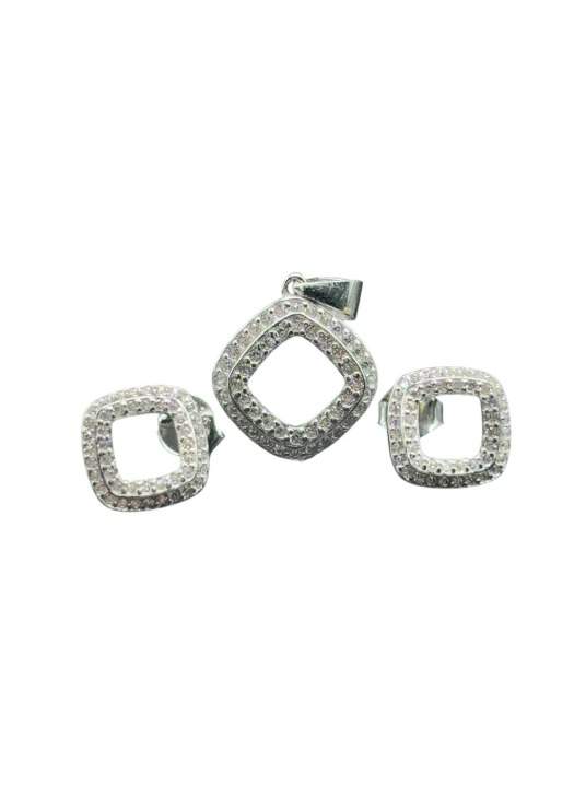 JUEGO DE DIJE Y ARETES ROMBO EN RELIEVE CALADO CON 2 FILAS DE CIRCONIAS BLANCAS ALREDEDOR