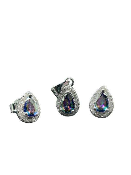 JUEGO DIJE Y ARETES DISEÑO GOTA PEQUEÑO DE TOPACIO MISTICO Y CIRCONIAS BLANCAS ALREDEDOR