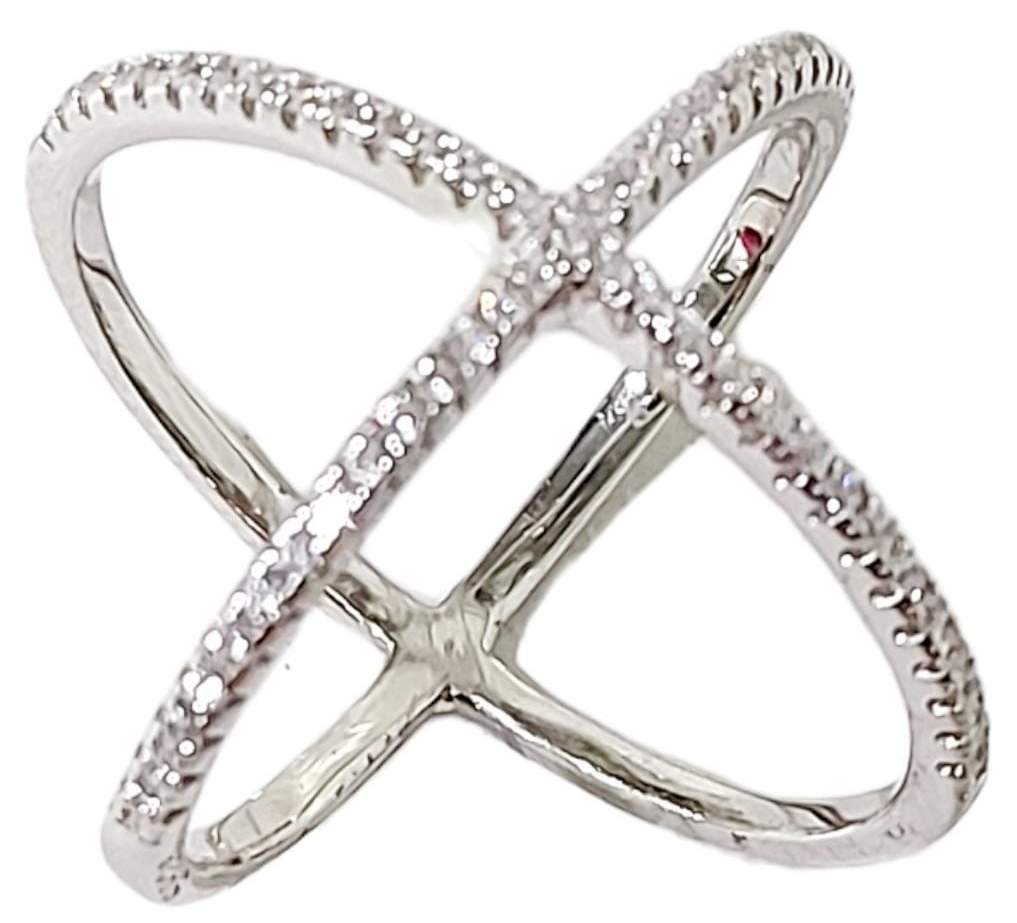 anillo con forma de x con circonias blancas
