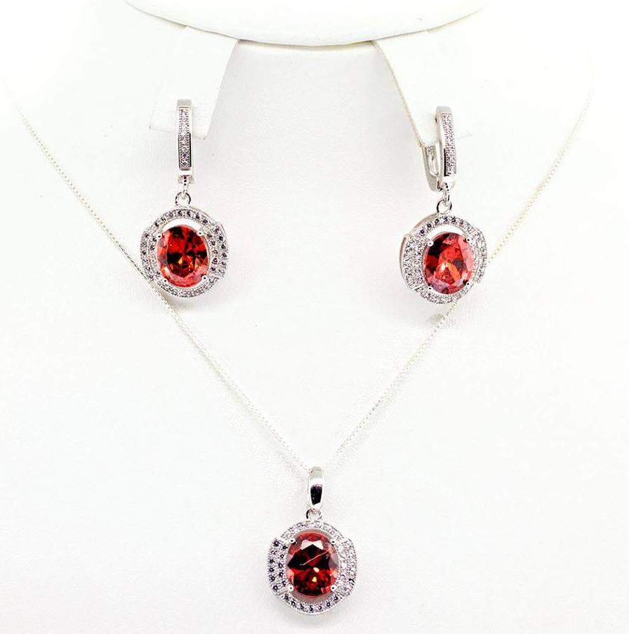 JUEGO DIJE Y ARETES CIRCONIA ROJA CON DOS FILAS DE CIRCONIAS A LOS LADOS (NO INCLUYE CADENA)
